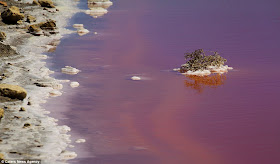 Những đụn muối trắng có thể trồi lên giữa không gian tràn ngập màu đỏ của nước.