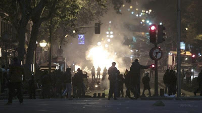 Tôi đã ở đó cách đây 1 giờ, những vụ nổ, khói bốc lên, mọi người vừa chạy vừa la hét, lựa đạn cháy tấn công cảnh sát và bạo loạn đang diễn ra tại vùng trung tâm Madrid.