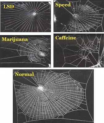 Vào năm 1995, một nhóm nhà khoa học của NASA đã lặp lại và nhận được kết quả qua việc thử nghiệm các loại chất kích thích lên khả năng xây dựng mạng lưới của loài nhện vườn. Họ đã thử nghiệm tác dụng của caffeine, banzedrine, cần sa và chloral hydrate và bạn có thể thấy kết quả rõ ràng từ những bức ảnh sau!